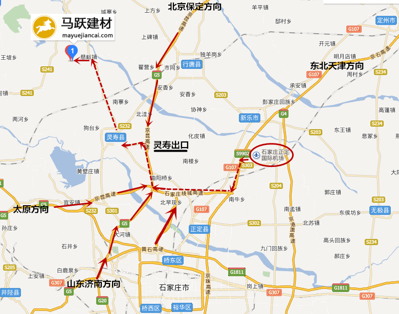 1、北京(京昆高速)—靈壽縣城—慈峪鎮(zhèn)—馬躍建材